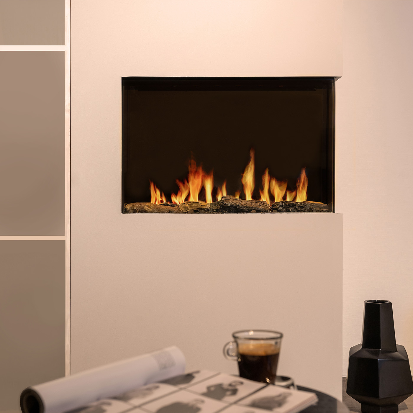 De haard geeft naast sfeer ook warmte af tot 2 kW. Met de Wanders Multi 30” creëer je in een handomdraai een warme, knusse sfeer in huis, met het comfort van moderne technologie.